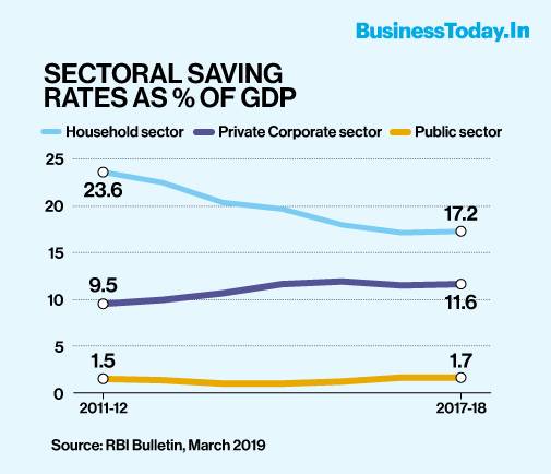 Source: Business Today, https://www.businesstoday.in/current/economy-politics/decoding-slowdown-dip-in-household-savings-investment-an-indicator-of-structural-economic-slowdown/story/380394.html