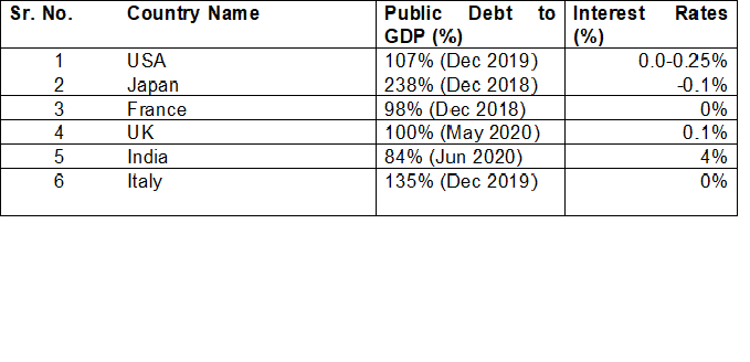 As per International Institute of Finance, Global Debt rose 10 trillion dollars in 2019 topping 255 trillion dollars. This was 40% higher than the 2008 financial crisis. In 2020, we have the Covid pandemic causing heavy damage to the economy. Most countries have opened their financial war chests and trying to stem the global deflation through stimulus for households, small businesses and various industries. The total stimulus till date is in excess of 10 trillion dollars. Given that trade has been suffering for most of the year and local economies struggling to get back to pre covid levels, we expect majority of the stimulus to be debt funded and will further add to debt to GDP ratio which was already at a high of 322% (Source: IIF, April 2020). As global GDP is expected to decline by 3% and debt expected to increase by tens of trillions of dollars, one can be certain that the global debt to GDP will soon be touching 400%. The USA which is the largest country in GDP terms already faces trillion-dollar budget deficit has announced 6 trillion dollars of stimulus and is expected to announce further stimulus to get the economy on track.