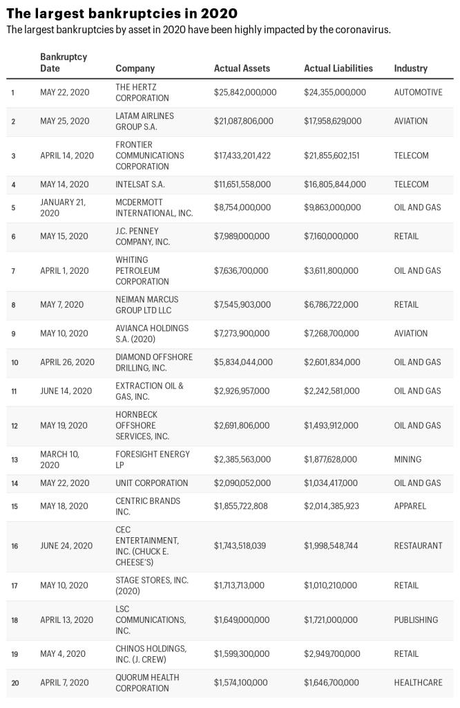 The magnitude of bankruptcies this year if compared with Asset size has already surpassed that of 2008 even after excluding the government’s Pay check Protection Program(669 billion dollars) and 2 trillion dollars of CARES Act, which aims to keep small businesses up and running with loans that can be converted to grants if certain terms are met, runs out and to provide economic assistance to American workers and families.