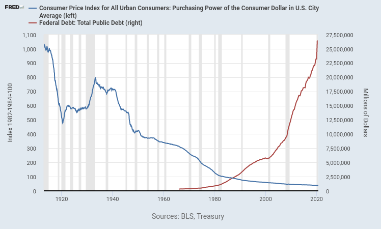 As we know fiat currency has only been in use throughout the globe for the past few centuries. However, it has been a bad store of value. The best performing currency over the last century has been the swiss franc which has lost only 80% of its value. The dollar has lost 97% of its value over the last century. While inflation has been key reason for the loss of purchasing power, one also needs to see the debt that these issuing countries have as it has a big impact on the currency. The only one time there has been increase in the purchasing power has been the great deflation period of 1929-1937. Deflation helps in increasing purchasing power as it makes cost of goods and services cheaper but also leads to increase in debt burden.