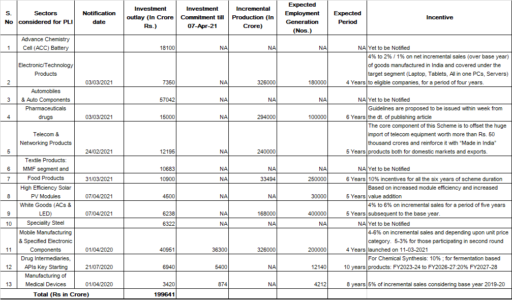 The following sectors and sub-sectors have been selected for the production linked incentive scheme (PLI)