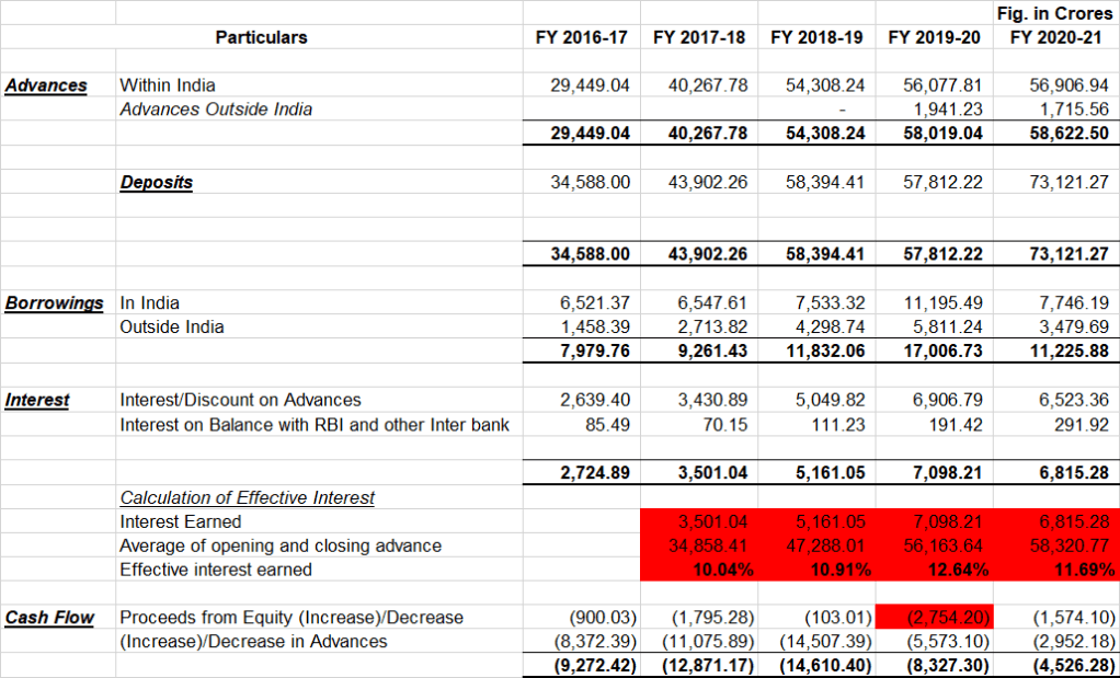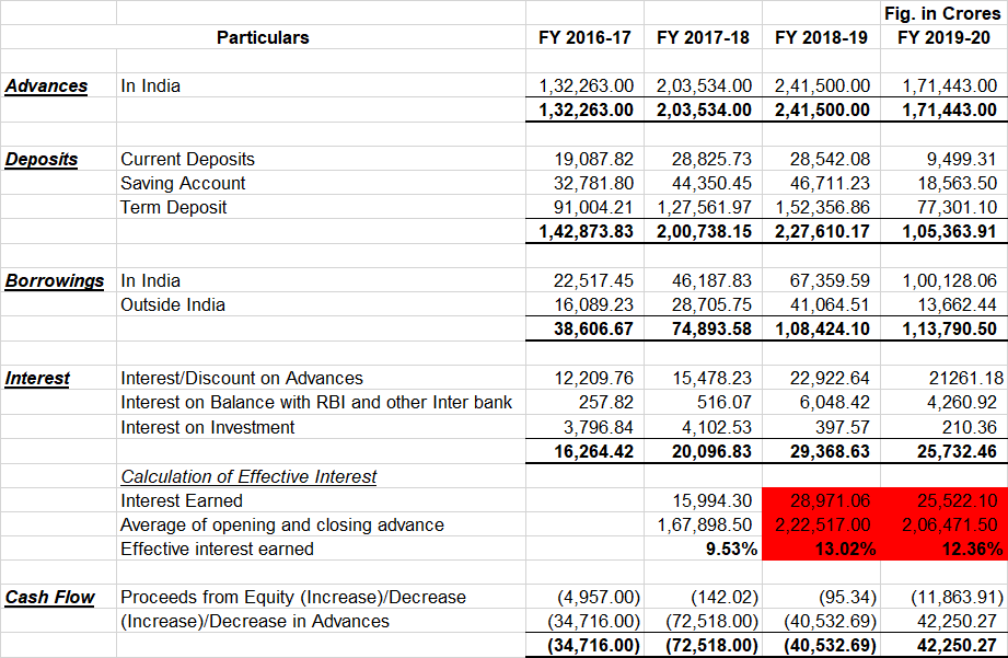 In case of effective interest earned, the average rate at which leading banks were earning was 8% to 9% while all of a sudden the the effective interest rate for Yes bank increased from 9.53% in FY 2017-18 to 13.02% in FY 2018-19. It usually happens when we have mismatch in our advances to borrowings/equity. This usually happens when we capitalise interest portion in our advances instead of receiving them or we have given large number of unsecured loans.