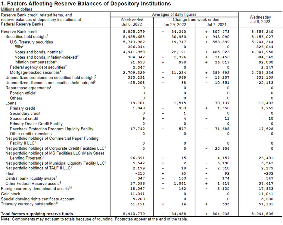 On 7th July 2022 Fed has uploaded its weekly Statistical release of “Factors Affecting Reserve Balances of Depository Institutions and Condition Statement of Federal Reserve Banks”