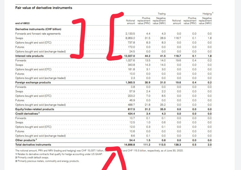While the whole noise is related to derivative products but nobody was able to explain the quantum.and category of product. The notional amount of total derivatives is roughly CHF 14.89 Trillion or 14.74 Trillion dollar and major exposure is in Forward and Forward rate agreements and swaps where majority of movement has happened in recent market correction. The unhedged portion against the size of trade is now becoming costly for Credit Suisse. The synthetic products are real risk in system. It eats up the whole reserves like Turmites and everytime you need bailout to safeguard the investors against probable losses. $12 Trillion alone in derivatives and 1.54 trillion dollar in Interest rate products make weird combination and gives more signs of mis-happening when we see turbulence in this market since last January 22.