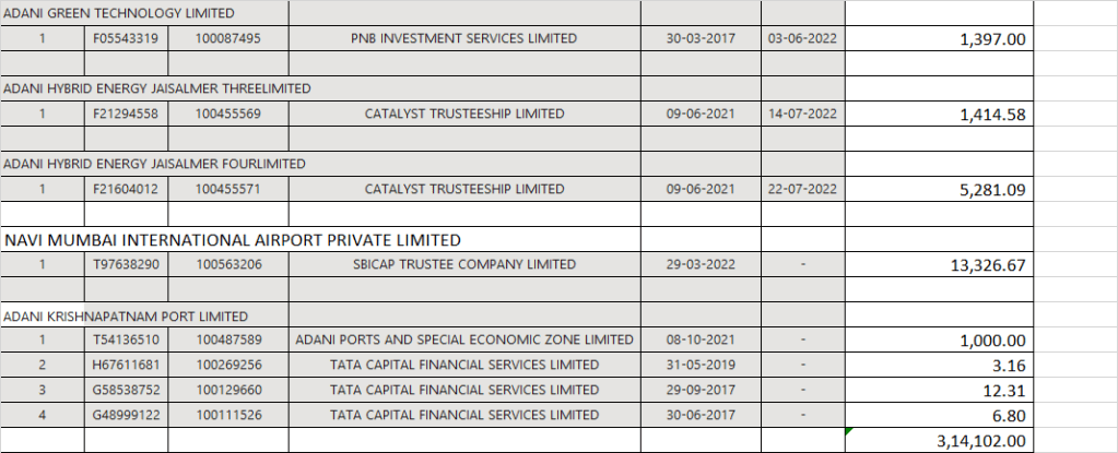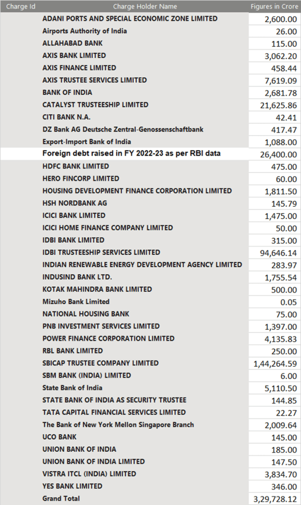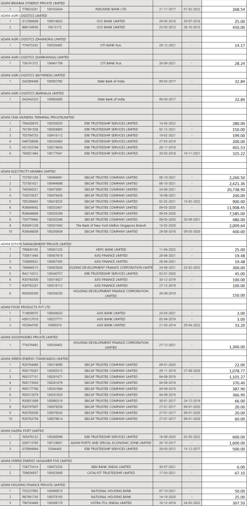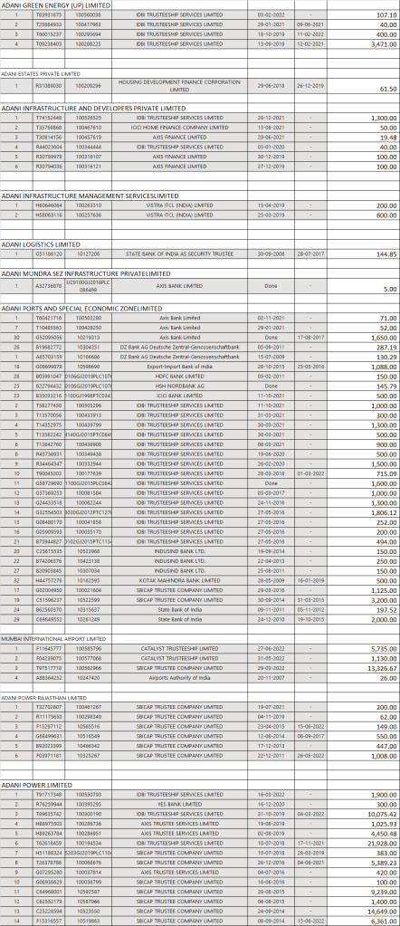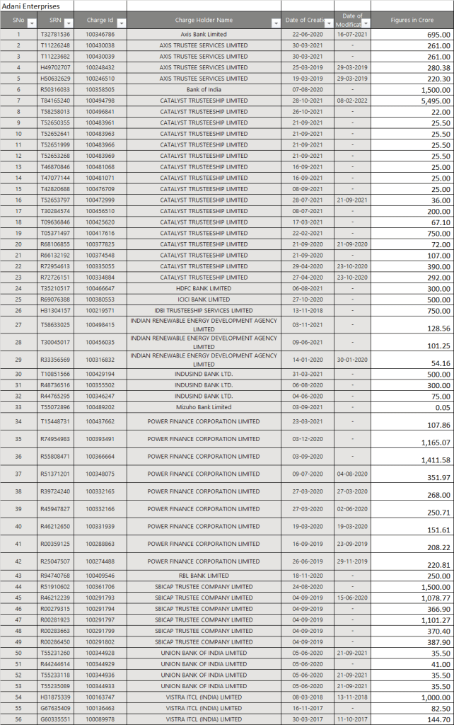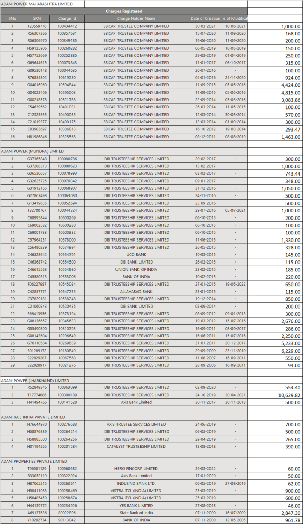 Had I been Adani group, I would have disclosed my registered charges details created with banks in the form of CHG 4 and disclosed each and every details regarding securities pledged with Banks and Debenture holders. So lets analyse the value of Assets mortgaged with Banks and the exposure as per the list of Charges registered at MCA portal.