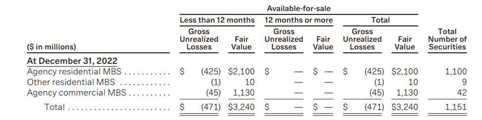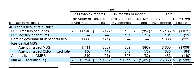 The following tables summarize our AFS securities in an unrealized loss position for which an ACL has not been recorded and summarized into categories of AFS securities that were in an unrealized loss position for less than 12 months, or 12 months or longer, as of December 31, 2022
