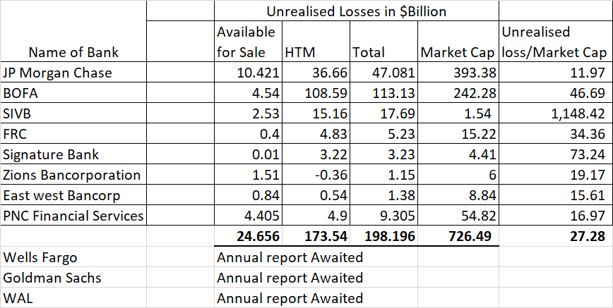 After the fiasco of Silicon Valley Bank due to the fire sale of 22 billion dollar causing 2 Billion dollar losses in Books, we tried to analyze the Unrealized losses of some Major Banks in USA. Tabular analysis is as under: