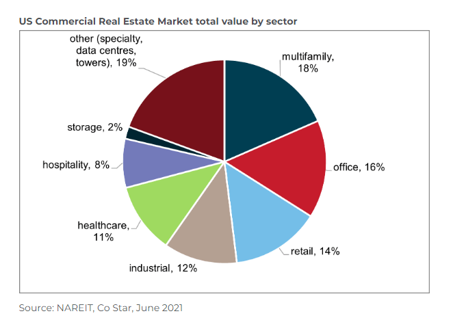According to the National Association of Real Estate Investment Trusts (NAREIT), the total value of the US commercial real estate market was estimated to be approximately US$20 trillion, of which US REITs represent around US$1.7 trillion.